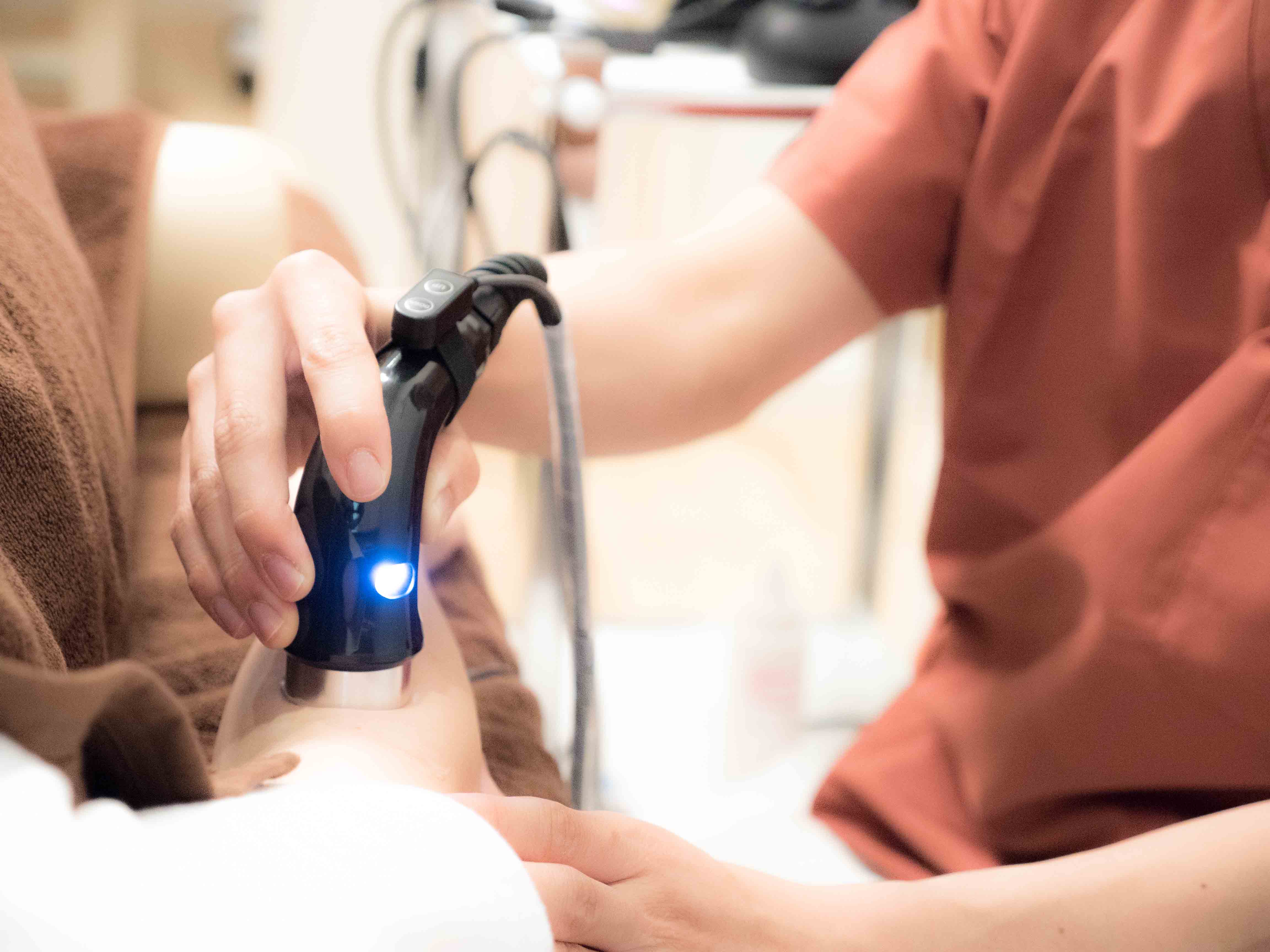 超音波とは、一秒間に100~300万回という体では感じる事が出来ない非常に細かい振動を、手では届かない深部まで到達させ血流改善し、筋肉の緊張緩和、ケガの早期回復を図るものです。